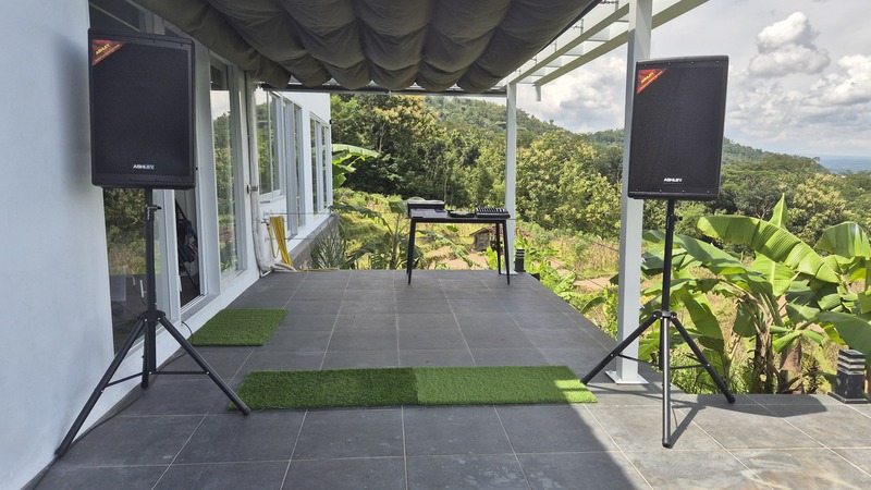 The equipment is available for your use free of charge. Please bring your own instruments and cables. The covered "stage" is 4x4 meters in size, and the terrace can accommodate about 100 visitors. Cars can park just in front of the house for deliveries. Parking is limited near the school/kindergarten.